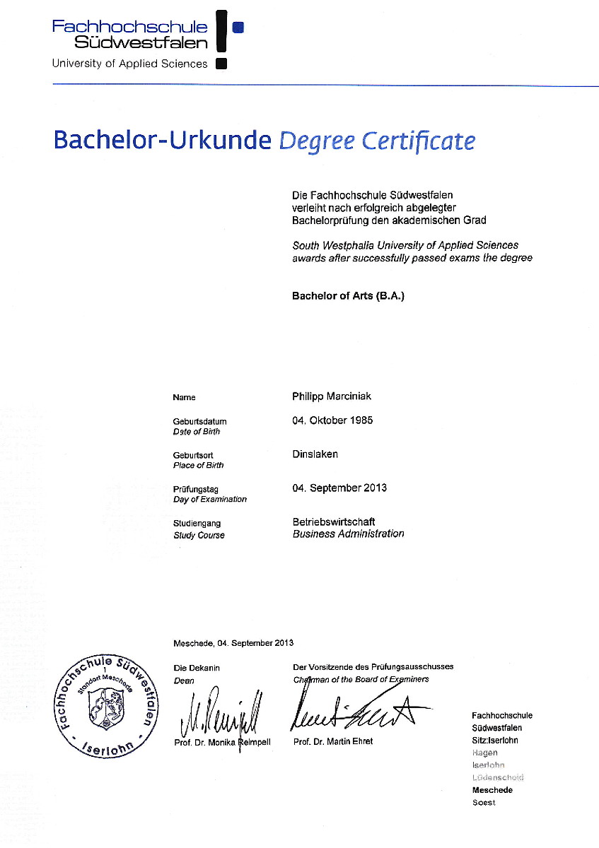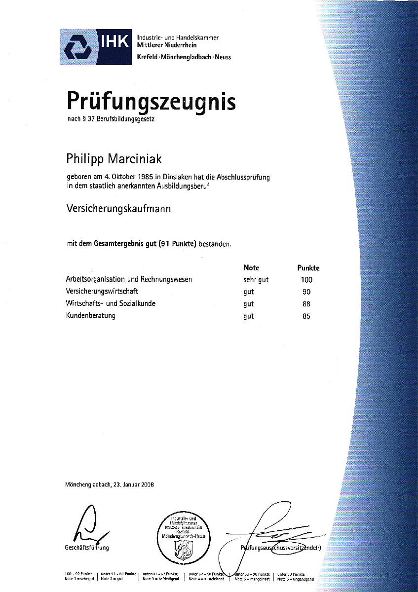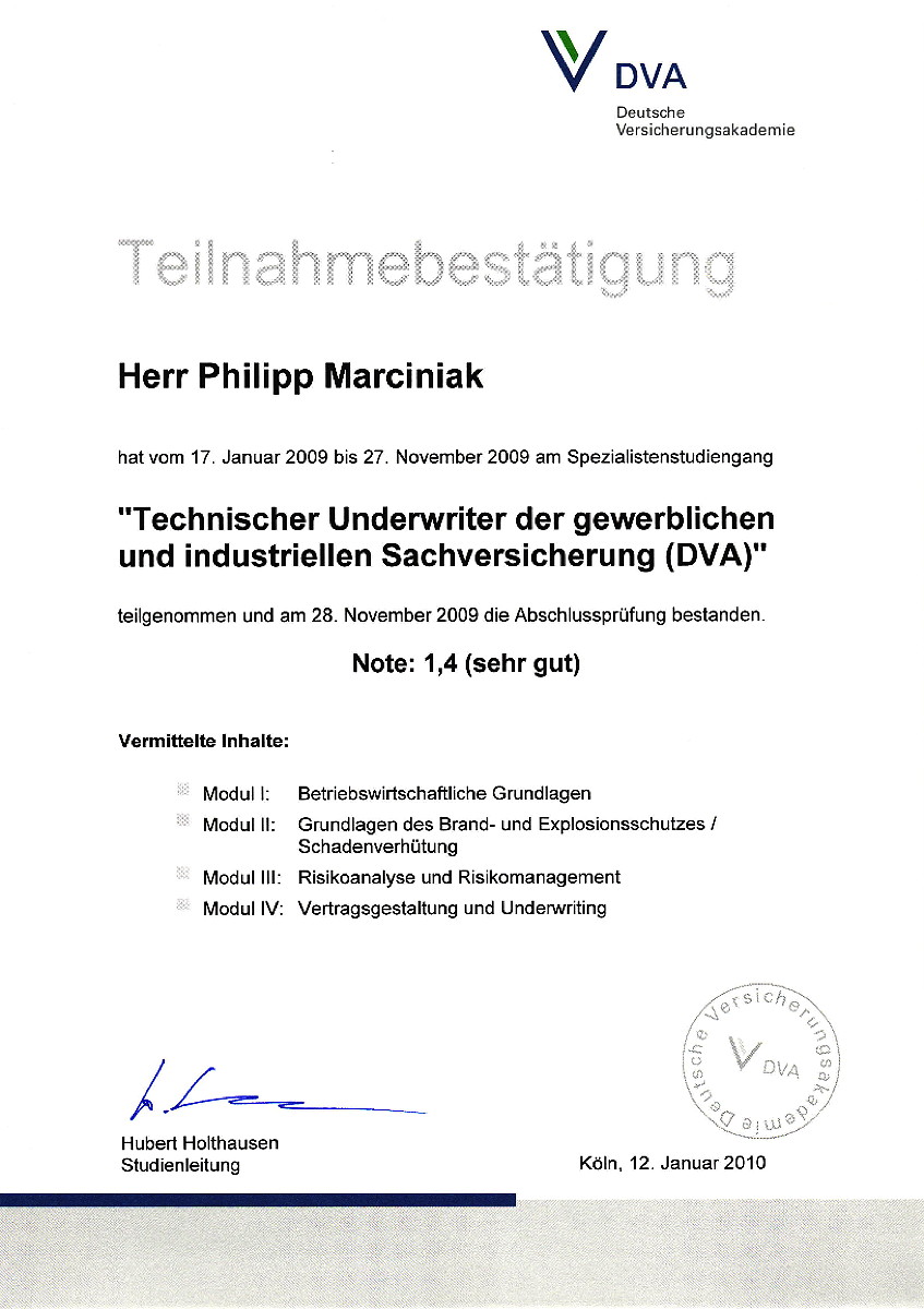 Geschäftsführender Gesellschafter Bachelor of Arts (B.A.) Technischer Underwriter der gewerblichen und industriellen Sachversicherung (DVA) Versicherungskaufmann (IHK)